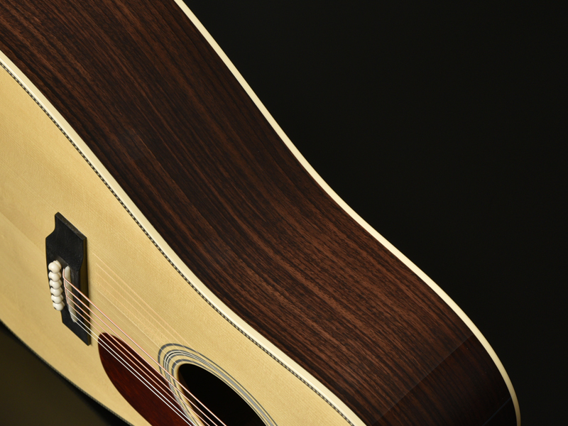 ボディトップ材には、飛鳥工場のストックの中から選定されたアディロンダックスプルースを使用しています。アディロンダックスプルースは北米アディロンダック産地で採れるレッドスプルースの一種です。現在では非常に希少な材料となっており、シトカスプルースに比べ外観では杢目の幅が広いのが特徴的で、その鳴りは豊かな低音を持ちながら、高音まで煌びやかに鳴るゴージャスなサウンドを奏でます。