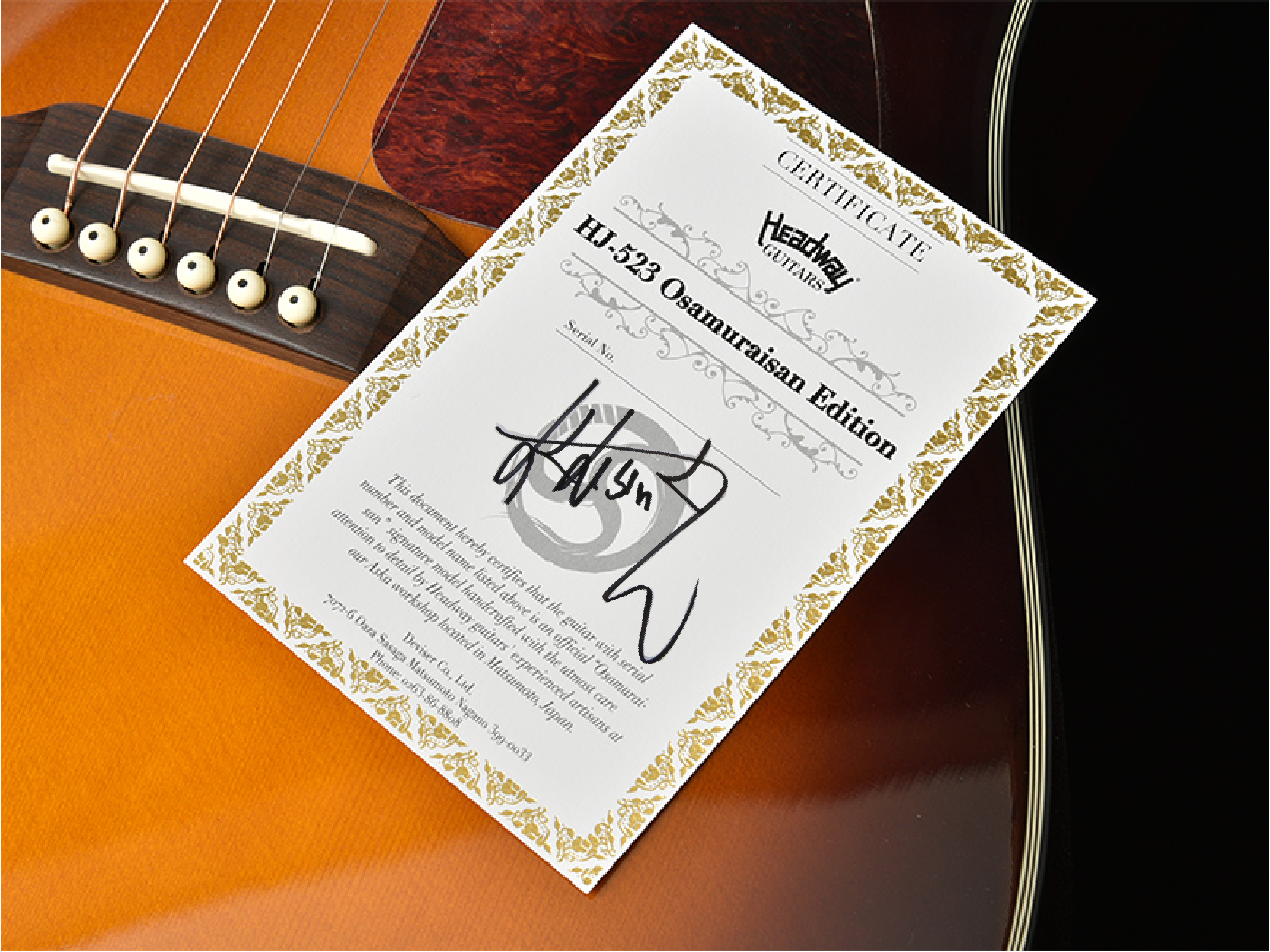 Osamuraisan’s signature model HJ-OSAMURAISAN II already released from Headway JT series has the concept of "a guitar that is easy for beginners to play", while the HJ-523 Osamurisan Edition is a kind of more high-end guitar. To certify the genuine products, a certificate signed by Osamuraisan himself is included.