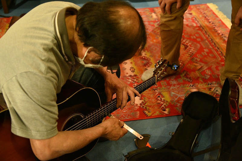 Master builder Momose inspecting the guitar closely