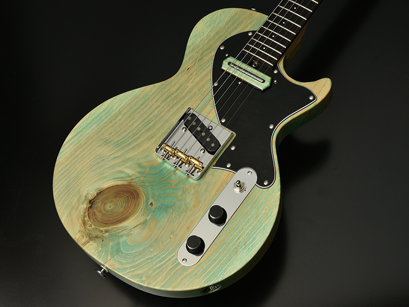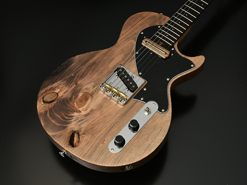 ボディの表から側面にかけて貫通する虫食いの穴、枝や根になろうとした形跡である節、局所的に変色したシミ、一般的なギター作りで嫌われる場所を全て含んだこの木材の個性を受け入れ、あえてその特徴を強調してこのギターのオリジナリティとして捉えてもらえるように様々な工夫を凝らしました。