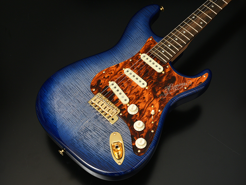 Flame Kaede:Japanese Wood Customとして和材を採用したギターを制作いたしました。ボディトップにはフレイム杢の出たカエデを採用。きめ細かく硬質で弾力性があり、材面には絹のような光沢が出ます。杢目を活かした藍色のバーストカラーで仕上げています。ボディバックには榛の木(ハンノキ)を採用しました。
