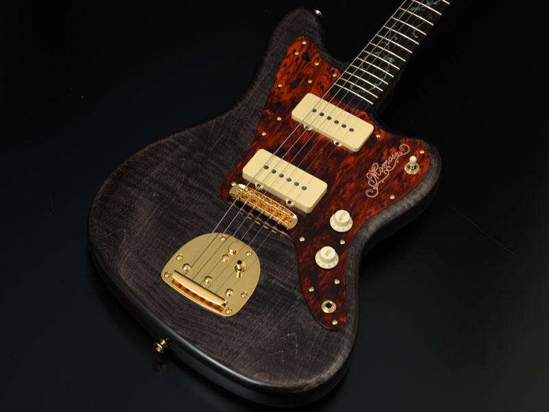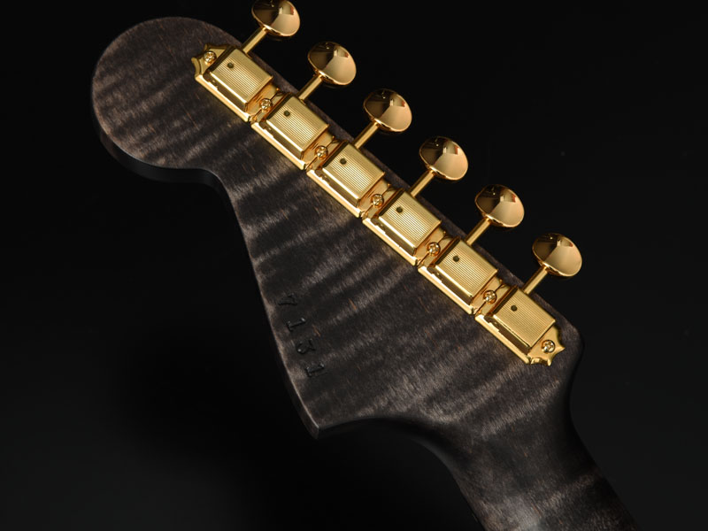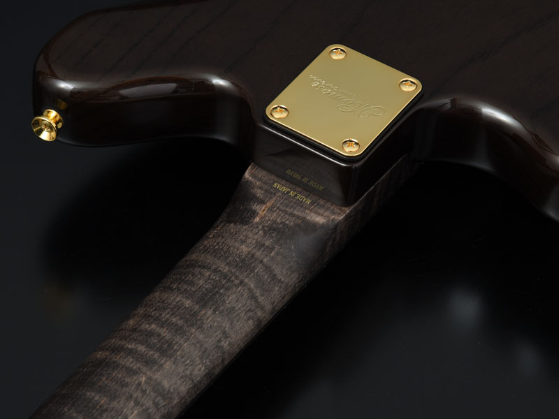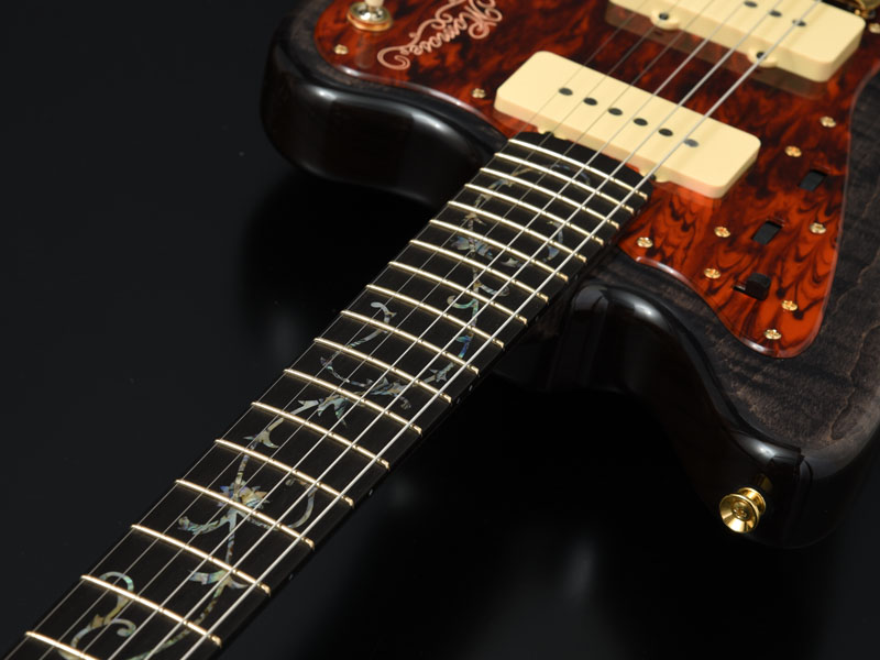 楽器フェア特別モデルとして、ボディトップ、ネックにフレイムメイプル、ボディバックを1ピースのアッシュ材でまとめた一本。 また、レギュラーモデルには使用していないフレット、JESCAR Evolutionは、 銅、錫、鉄、チタンから成り卓越した耐久性を誇ります。指板には楽器フェア特別モデルにふさわしいアバロンインレイが彩ります。ブラックカラーはフレイムメイプルの杢を際立たせ、グラデーショ ンのカラーは指板のアバロンをイメージしています。
