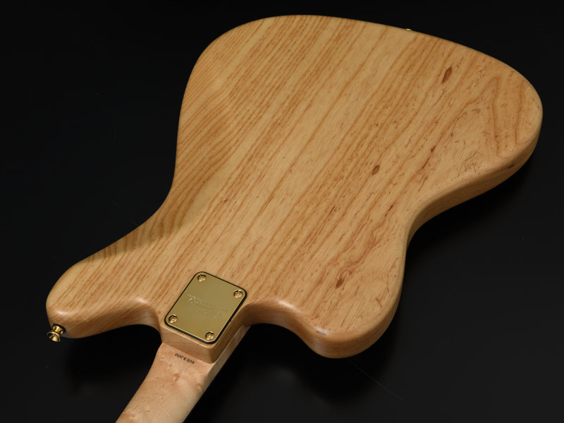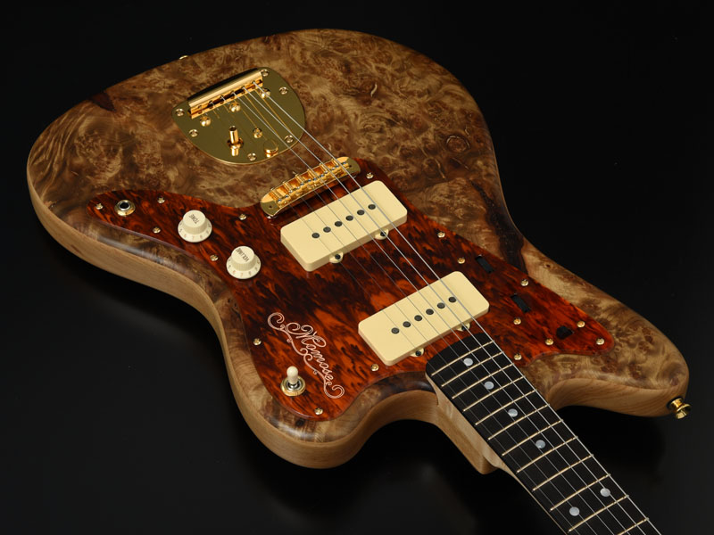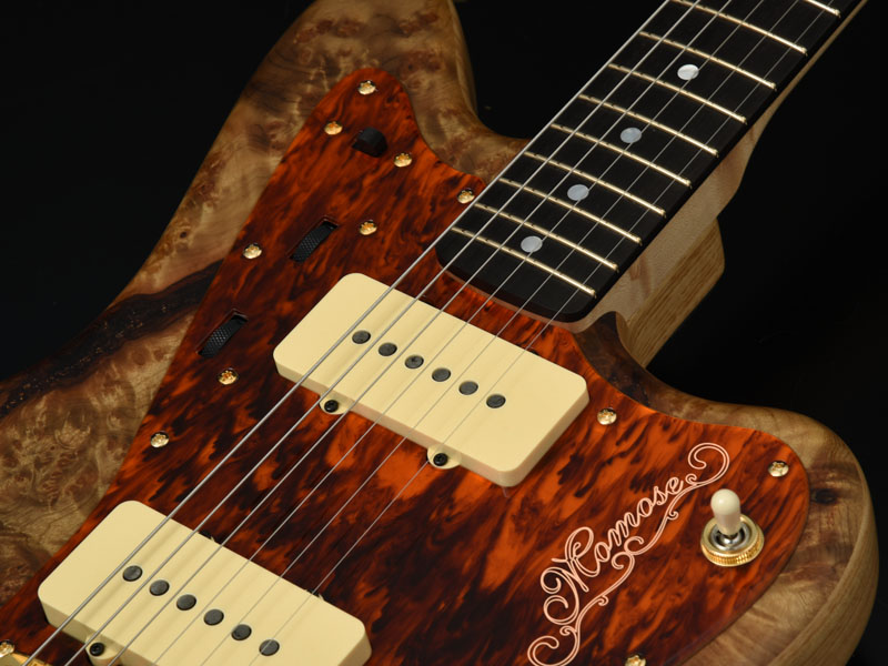 楽器フェア特別モデルとして希少材「マーブルウッド」を使用しており ます。 このマーブルウッドとは大理石という意味があり、独特な光沢感とイン パクトの大きな瘤模様が特徴で堅さのある希少材となります。南米産の 木材で縞模様のマーブルウッドと混同されやすい木材ですが、写真のこ のマーブルウッドはミャンマーや中国では「黄金樟」と呼ばれる大変希 少な材として知られます。ミャンマーでは三大国宝に数えられると聞き ますが、希少な材で日本ではあまり情報がないのが現状です。 このマーブルウッドの黄金色を活かすカラーに仕上げています。またボ ディバックのアッシュは贅沢に1ピース、ネックにはバーズアイメイプ ルが使用されています。