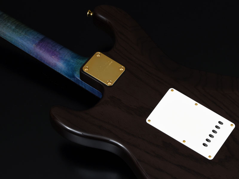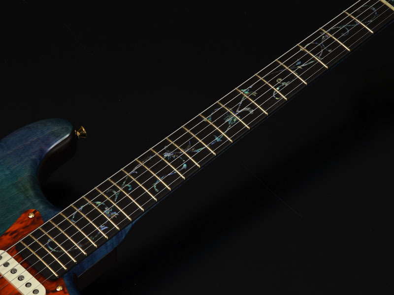 楽器フェア特別モデルとして、ボディトップ、ネックにフレイムメイプル、ボディバックを1ピースのアッシュ材でまとめた一本。 また、レギュラーモデルには使用していないフレット、JESCAR Evolutionは、 銅、錫、鉄、チタンから成り卓越した耐久性を誇ります。 指板には楽器フェア特別モデルにふさわしいアバロンインレイが彩りま す。ブラックカラーはフレイムメイプルの杢を際立たせ、グラデーショ ンのカラーは指板のアバロンをイメージしています。