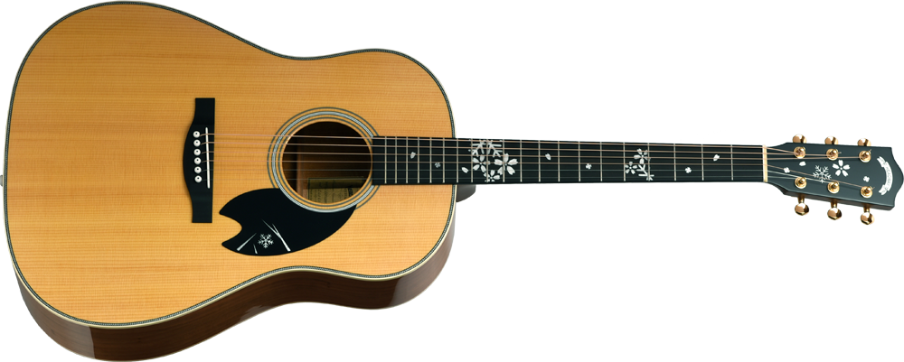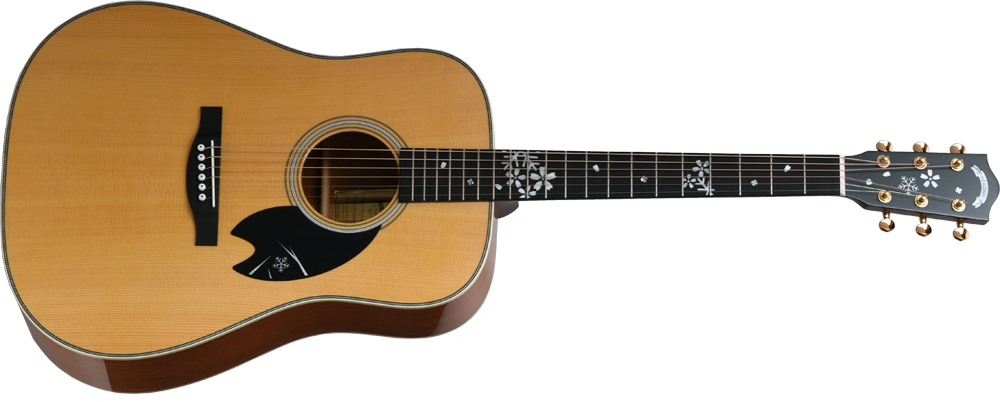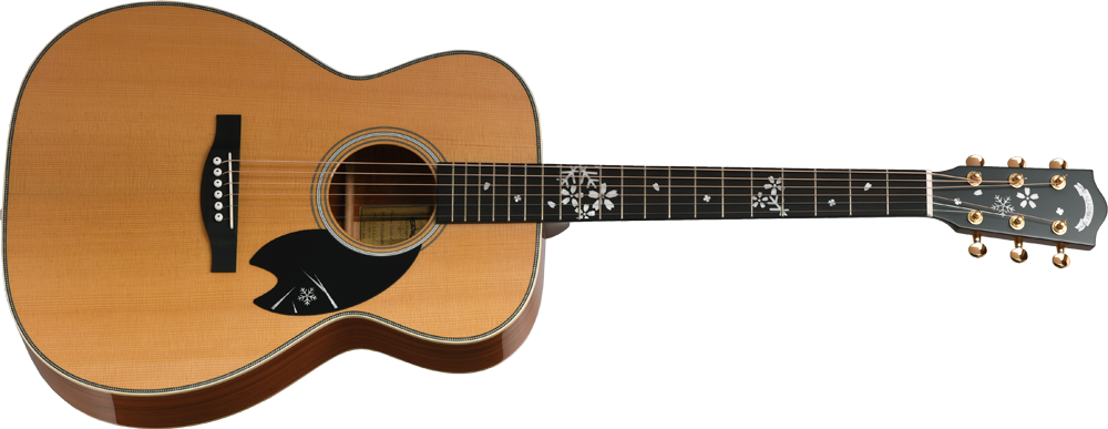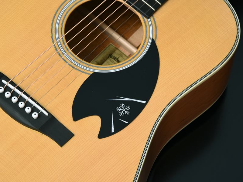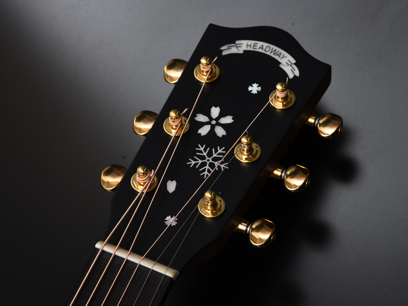 Headway Standard series HD-Fuyuzakuraは「冬桜」というテーマでギターをデザインしました。桜の木をボディのサイド・バックに使用し、真っ黒なエボニーをブリッジや指板に使用することで、これまでの桜モデルに比べて少し落ち着いた雰囲気があります。