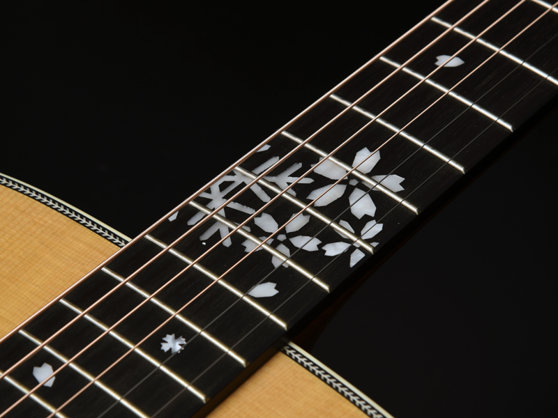 漆黒のエボニー指板上で七色に輝くインレイは、個性を放ちながらも落ち着きがあり、いつまでも弾き続けられるような上品なデザインです。