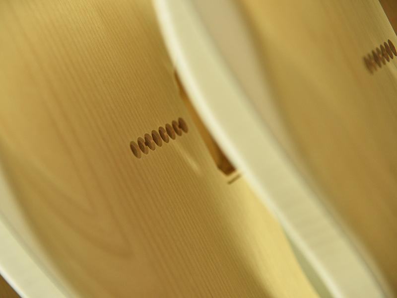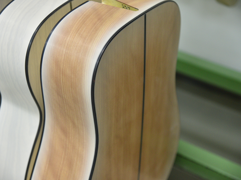 木材の時点でよくよく見るとややピンク色をしている桜材。材質は粘りがあり適度に硬質、明るく粒の揃ったサウンドが特徴的です。職人こだわりの桜モデルは、デザインも心をくすぐるモデルばかり。筆者も桜モデルが出る度にインレイデザインや、塗装のカラーに見とれてしまいます。