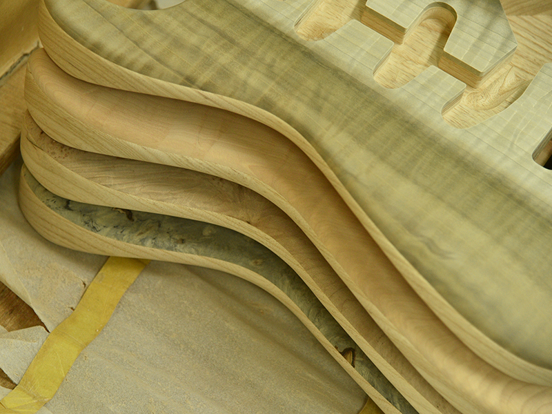 通常のボディトップ材は5mm以下になることが一般的ですが、こちらのモデルではフレイムトチとアルダーの1:1、いわば「ハーフ&ハーフ」で製作。極上の木材をふんだんに使用した、Bacchusならではの特別仕様となっています。 まだ塗装前のボディですが、塗装を施すことでより一層フレイム杢が際立ち美しくなります。