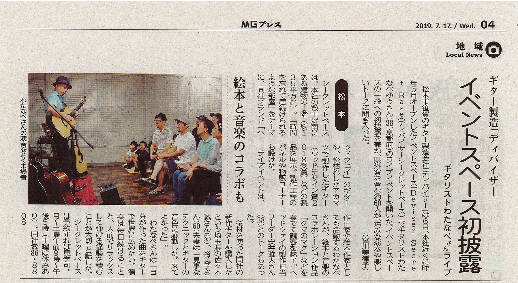公開時期 2019/7/17 Introduction 信濃毎日新聞社発行の地方紙・MGプレスにDeviser Secret Baseで開催されたわたなべゆうさんのライブの様子が掲載されました。 Brand Headway Guitars Submitted by dev-web6 on 2019/7/17(Wed) 10:17