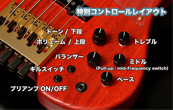 本人の希望を細かくヒアリングしてデザインされた特別なコントロールレイアウトは多彩な音作りが可能な3バンドEQとパッシブトーンを備え、アクティブ/パッシブのどちらでも実用的な音作りが可能。キルスイッチとパッシブ/アクティブ切り替えスイッチはブリッジの近くに配置され素早くアクセスが出来る。アウトプットジャックをサイドでは無くトップに配置することにより、ベーススタンドへの配置や床置きの際にシールドが邪魔にならず、ベースの持ち替え時などの利便性が向上した。