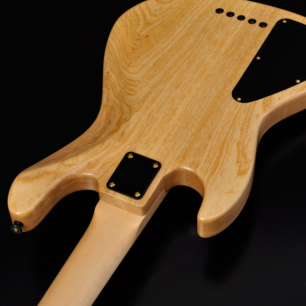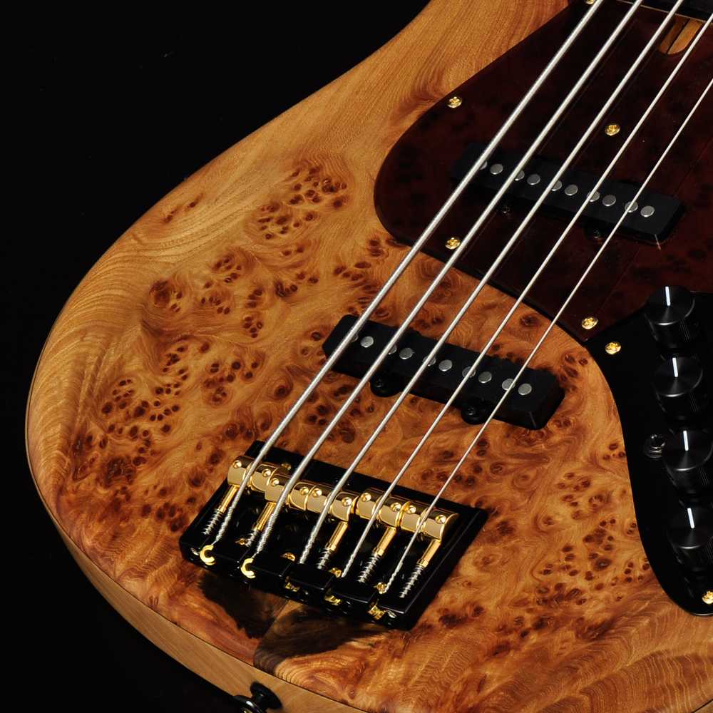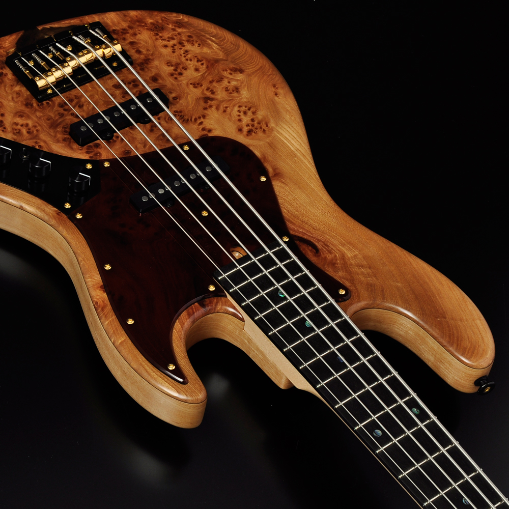 樹木の根の近くにできるこの杢とエルムがもつ独特な淡褐色を活かすようナチュラルカラーを採用しました。ハードウェアにはBlack & Goldのコンビネーションブリッジを配し、高級感のあるルックスで個性的な一本に仕上がりました。パッシブ、アクティブそれぞれ4弦、5弦モデルを合計32本の限定製作です。