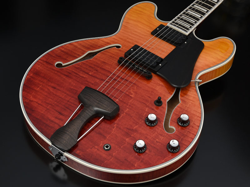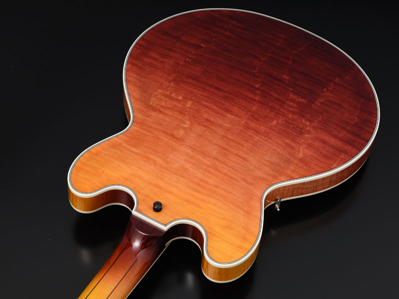 ボディ材に合わせ、色味にこだわった絶妙なグラデーションカラーと、新たにデザインから書き起こしたフレイムメイプルのテールピース、エボニー製のピックガードにもご注目ください。
