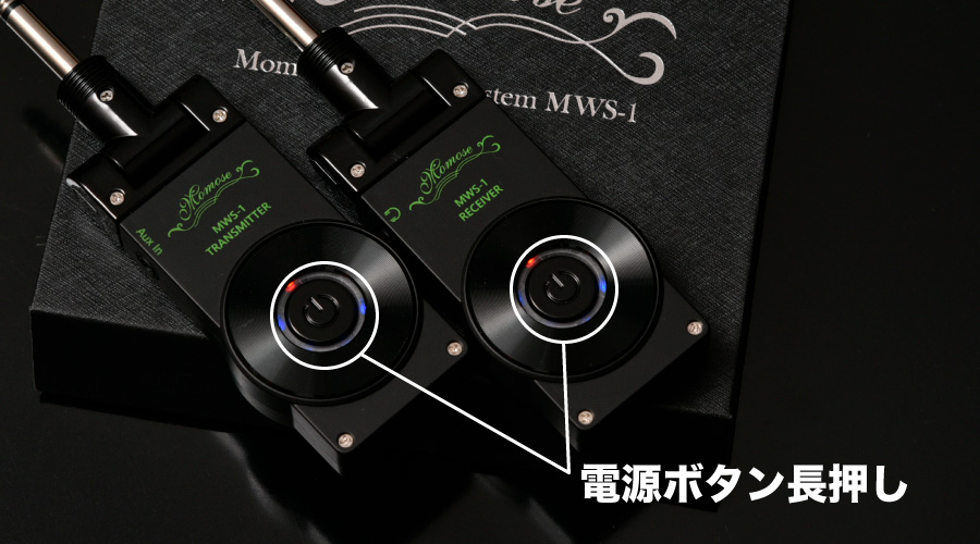 本体の電源ボタンを長押しするとペアリング待機状態になります。トランスミッター、レシーバーそれぞれが待機状態になるとペアリングされ使用可能となります。この時設定されたペアリング情報は電源を切っても記憶され、次回起動時も同じペアですぐに使用できます。