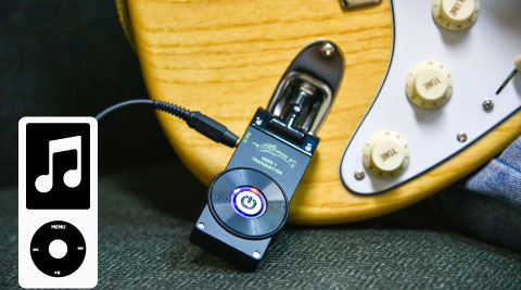 トランスミッターの外部入力(Aux In)に音源を接続すれば、音源を流しながら演奏が可能です。