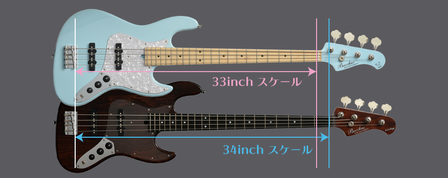 エレキベースの最も一般的なスケールである34インチより1インチ(約2.5㎝)短い33インチスケールを採用。フレットの間隔が若干狭くなることにより運指がしやすくなり、弦のテンションが低くなることにより弦が押さえやすくなるといったメリットがあります。手の小さい女性やエントリークラスプレーヤーにお薦めです。ミディアムスケール(32インチ)やショートスケール(30インチ)と比較するとサウンドに与える影響は抑えられ、比較的演奏するジャンルや音楽性を選ばずに使用することができます。