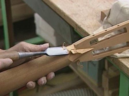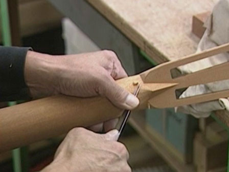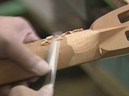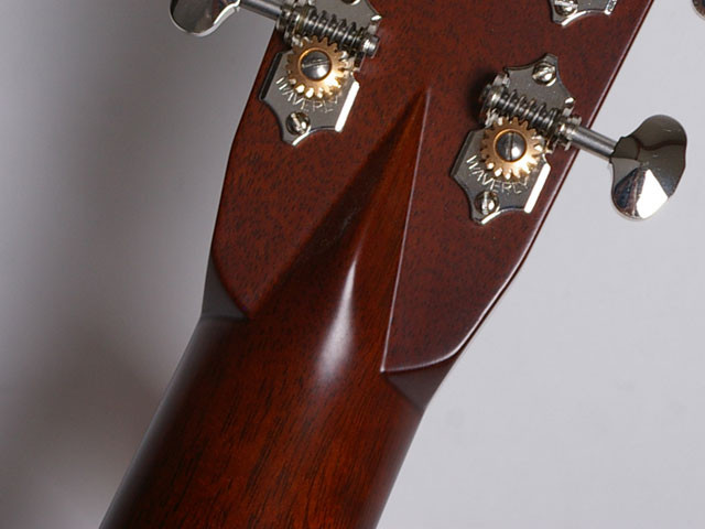 ヘッドウェイでも多くのモデ ルにこのボリュート加工が施されています。荒削り後、のみ、ナイフそしてサンドペーパーを使用し、職人の手により一本一本削り出して行きます。手の掛かる 部分ですが耐久性、そして高級楽器としての質感を高めてくれます。