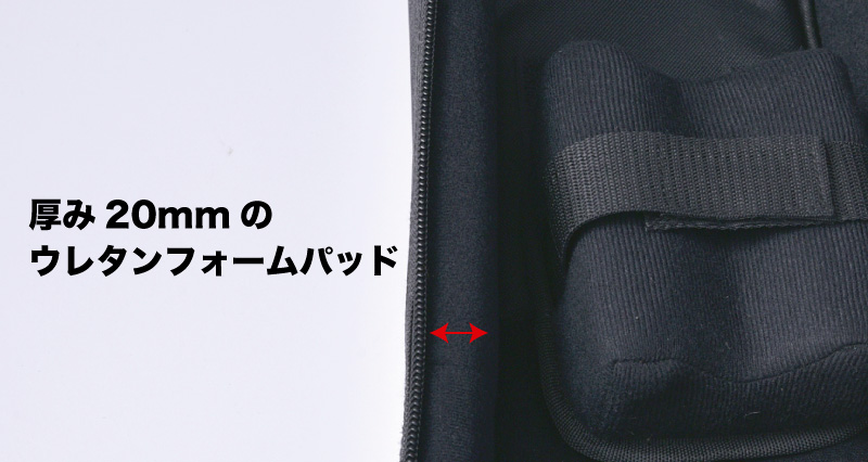 前面、背面、側面の全てに20mm厚のウレタンフォームパッドが入っていますので、ギターを優しく保護し、外側から来る衝撃からギター本体を守ります。