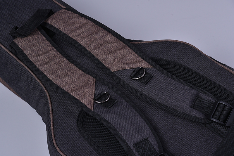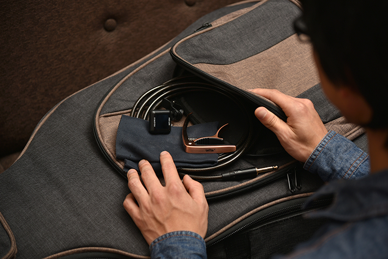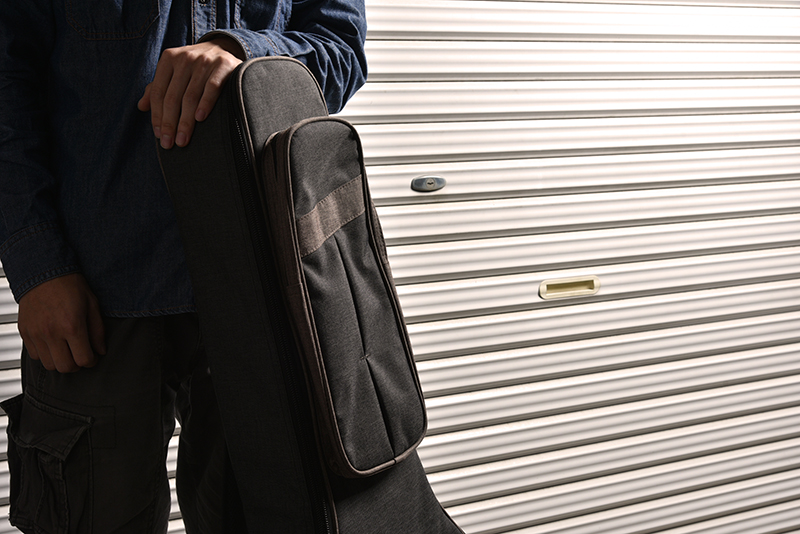 織りの質感が特徴あるオックスフォード生地を使用した外装。カラーラインナップはブラックxブラウンおよびグレーxブラウンの2パターン。落ち着いた色合いで、TPOを選ばずお使いいただけます。人目に触れる機会が多いギグバッグだからこそ、見た目の雰囲気の感じが良いかどうかは大事なポイントです。