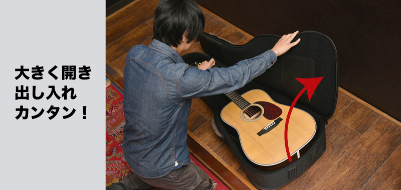ギター収納部のファスナーの可動域が広く、前面部分をパタリと向こう側へ開くことができます。これでHDやHJといった大きめのボディもファスナー等の擦り傷の心配なく出し入れ可能!