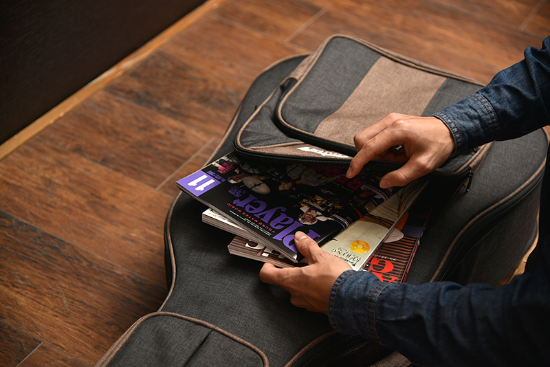 また、ボディ部奥側ポケットBは雑誌、譜面などA4はもちろんB4弱位のサイズまで収納可能。外側のポケットCにはクロスやチューナー、アクセサリーを収納するのに最適です。