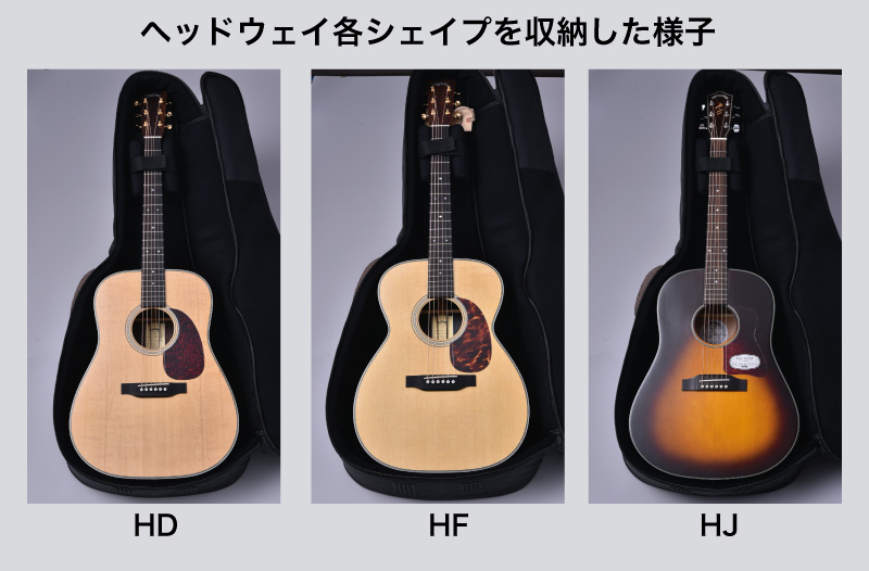 HD、HF、HJ他ヘッドウェイの主要シェイプは全て収納できます。ボディ側面側は少し余裕がありますが、ケースを閉じればグラつきも感じられず、楽器をしっかりとホールドします。