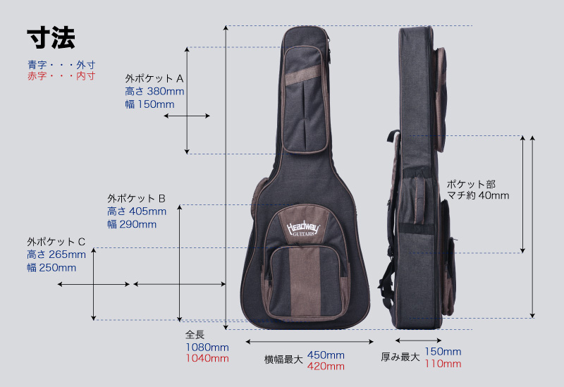 ヘッド部のポケットA部分は少し縦長のレイアウトで、コンパクトなギタースタンドやレザーストラップの様な硬めのストラップを余裕を持って収納できます。
