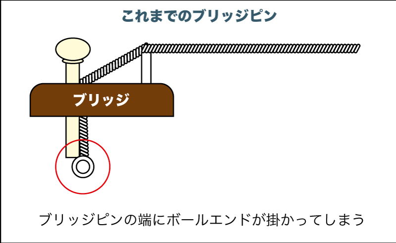 ↑スラントをネック側に向け(←重要)ブリッジピンを差し込むことで、ボールエンドはピンに掛からず、しっかりとボディ側に固定される。