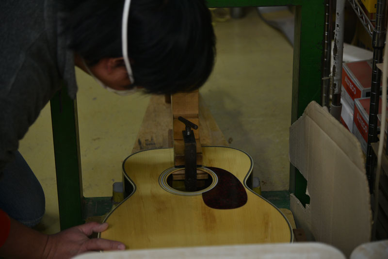 問題がなければ、ギター製作用のボンドを流し、専用の治具で固定します。