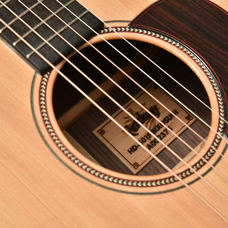 ボディトップの日光杉と同じ材料で作成した特別なサウンドホールラベルを製作!ヘッドウェイロゴ、モデル名、シリアルナンバーをウッド埋め込みで表現しました。