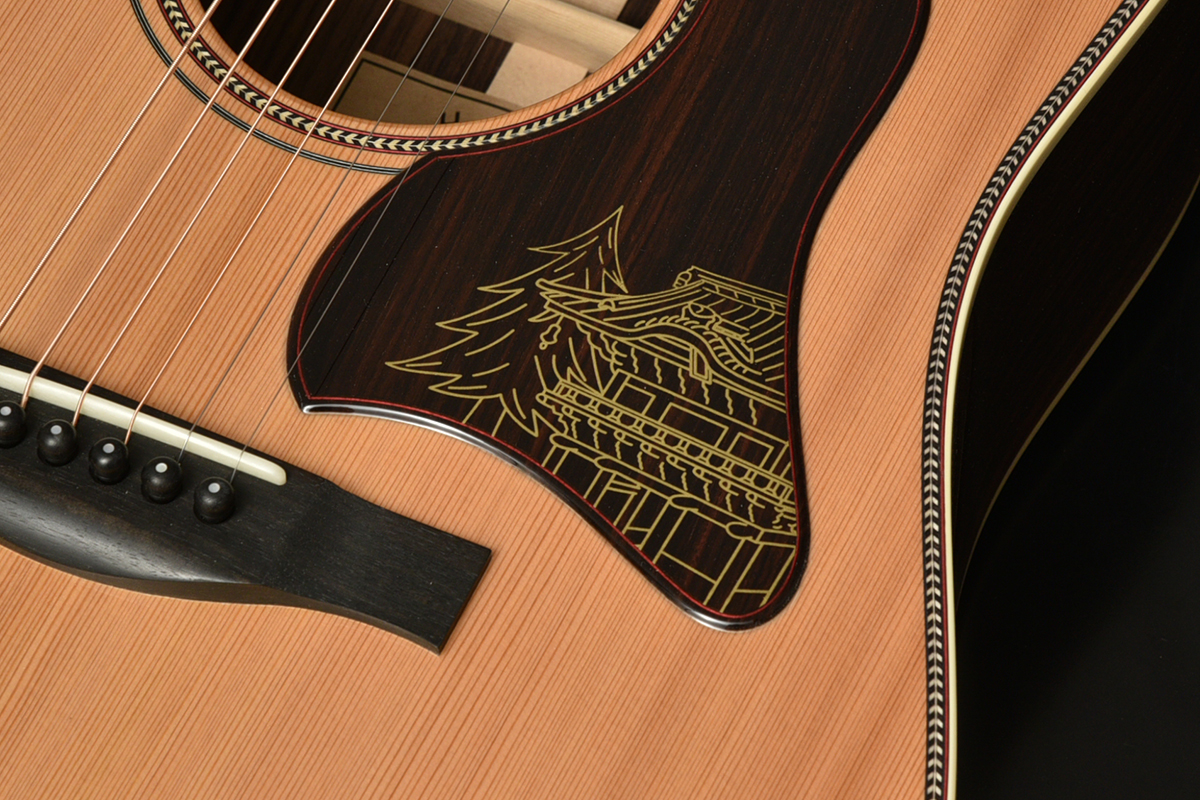 ピックガードには日光東照宮の代表的な建物「陽明門」と杉が入れられています。