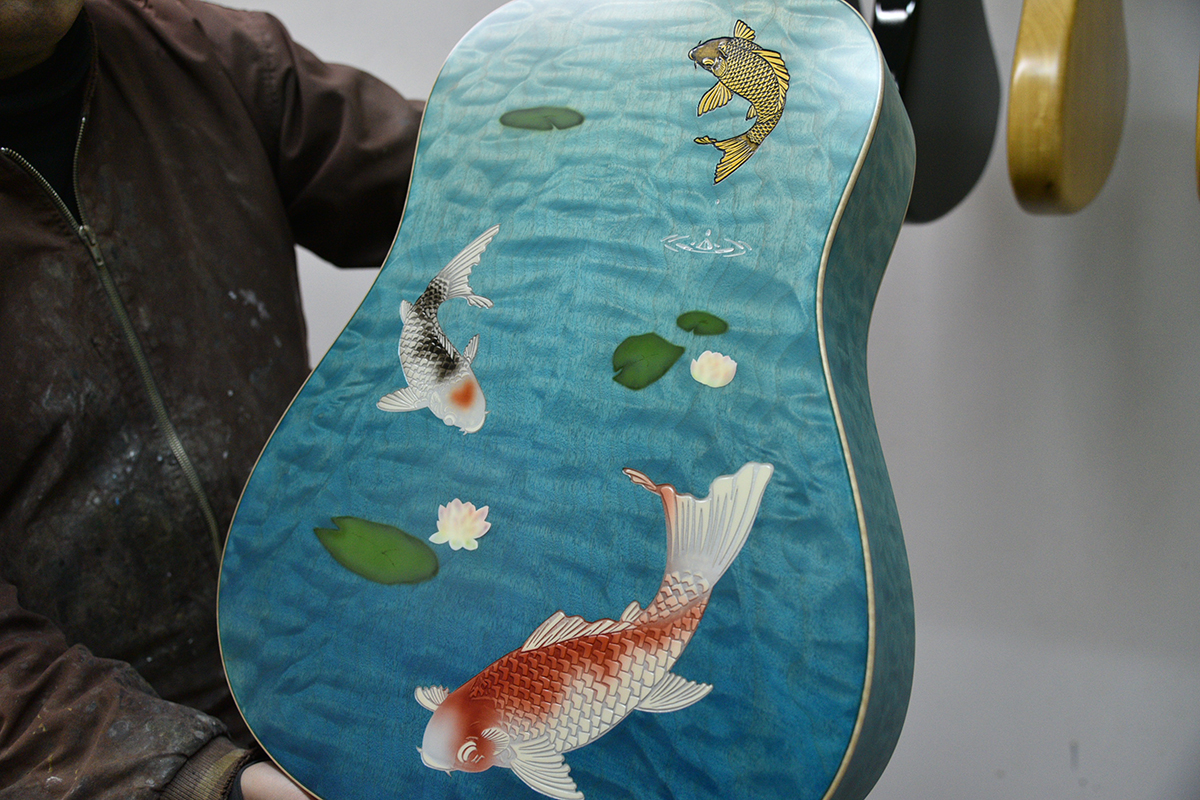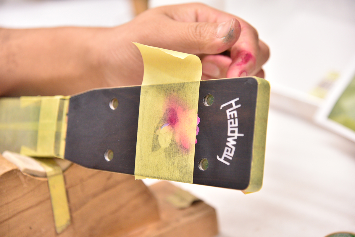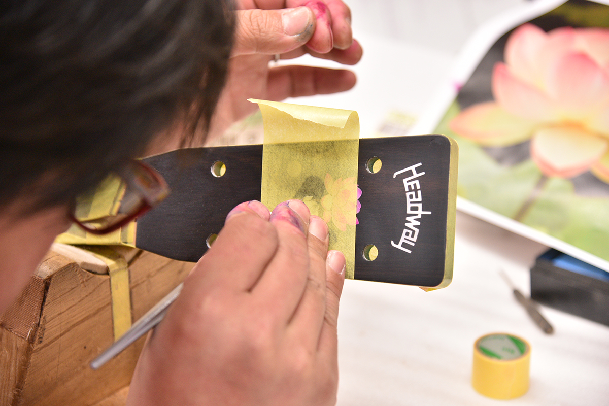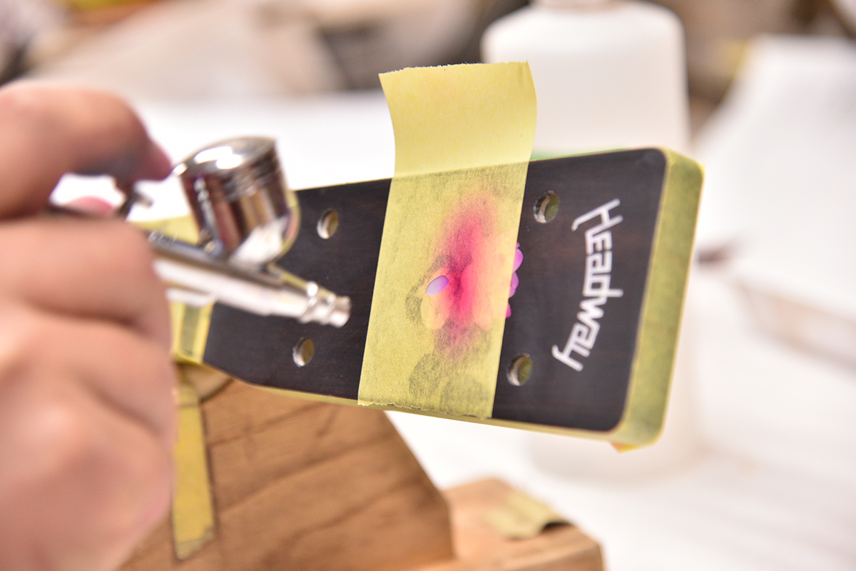 あらわになったインレイに塗料を吹き付け、蓮の花のグラデーションをシュシュっと入れていきます。