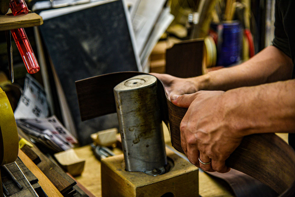 まず熱湯で煮込んだサイド板をHN型のアイロンで曲げ、HNのシェイプに曲がった板を、手作業でさらにHTの形に曲げていきます。一度熱を加えて曲がった板も、そのまま放置すれば元に戻ろうと動きます。曲げたあとの板を画像の通りHN+HTアタッチメントの型にはめ込み、ネックブロック、エンドブロックとともに接着して固定します。