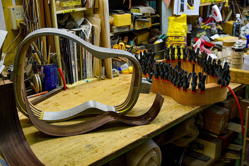 ↑手前がHNの型で曲げたサイド板、その後方、鉄製のHN型のネックジョイント付近とボディエンド部分に木製アタッチメントが追加されていることが分かる。これがHT用の型。画像右奥はその型で接着・固定したHTのボディサイド。