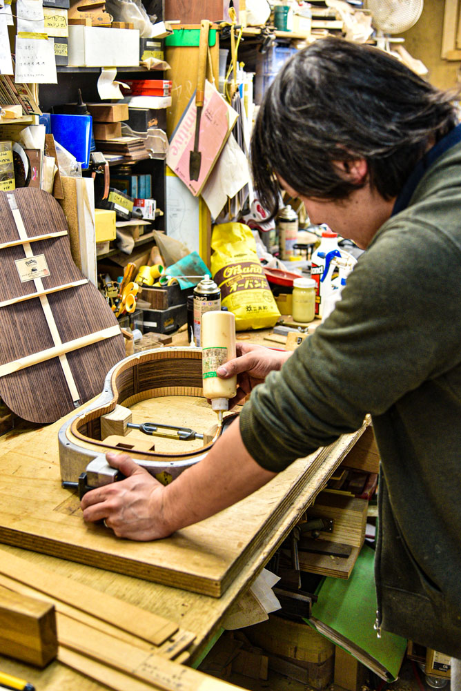 月に30本近くを製作するヘッドウェイATBシリーズにおいて今回製作されたHTはわずか3本。これにはギター製作上の手間が大いに影響しています。通常アコースティックギターを製作するために必要とされる治具(型や道具)は複数同じものを用意しており、一定の量産に対応出来るようにしています。しかし、このHT-615はその小さなボディの構造上、型を使えず手作業でなければ加工できない箇所があります。
