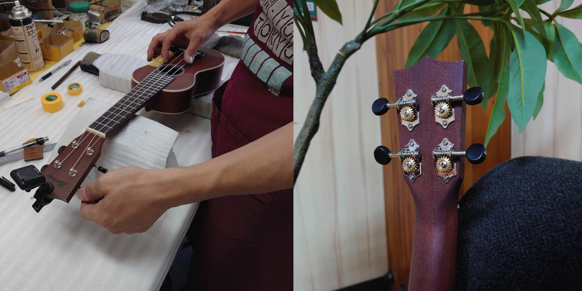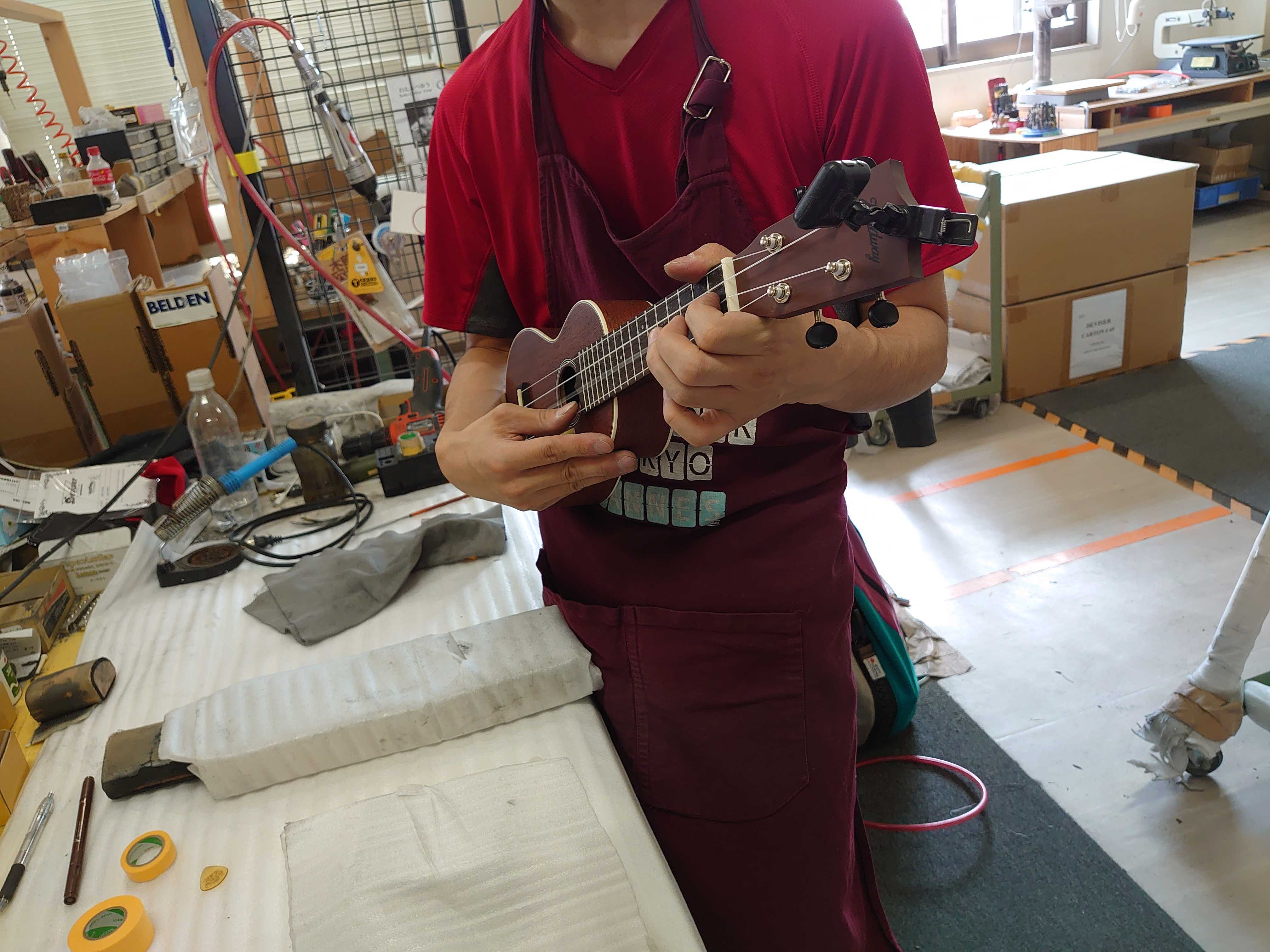 通常2~3万円代のウクレレでは海外工場で製作し、そのまま楽器店の店頭へ並ぶことがほどんどです。