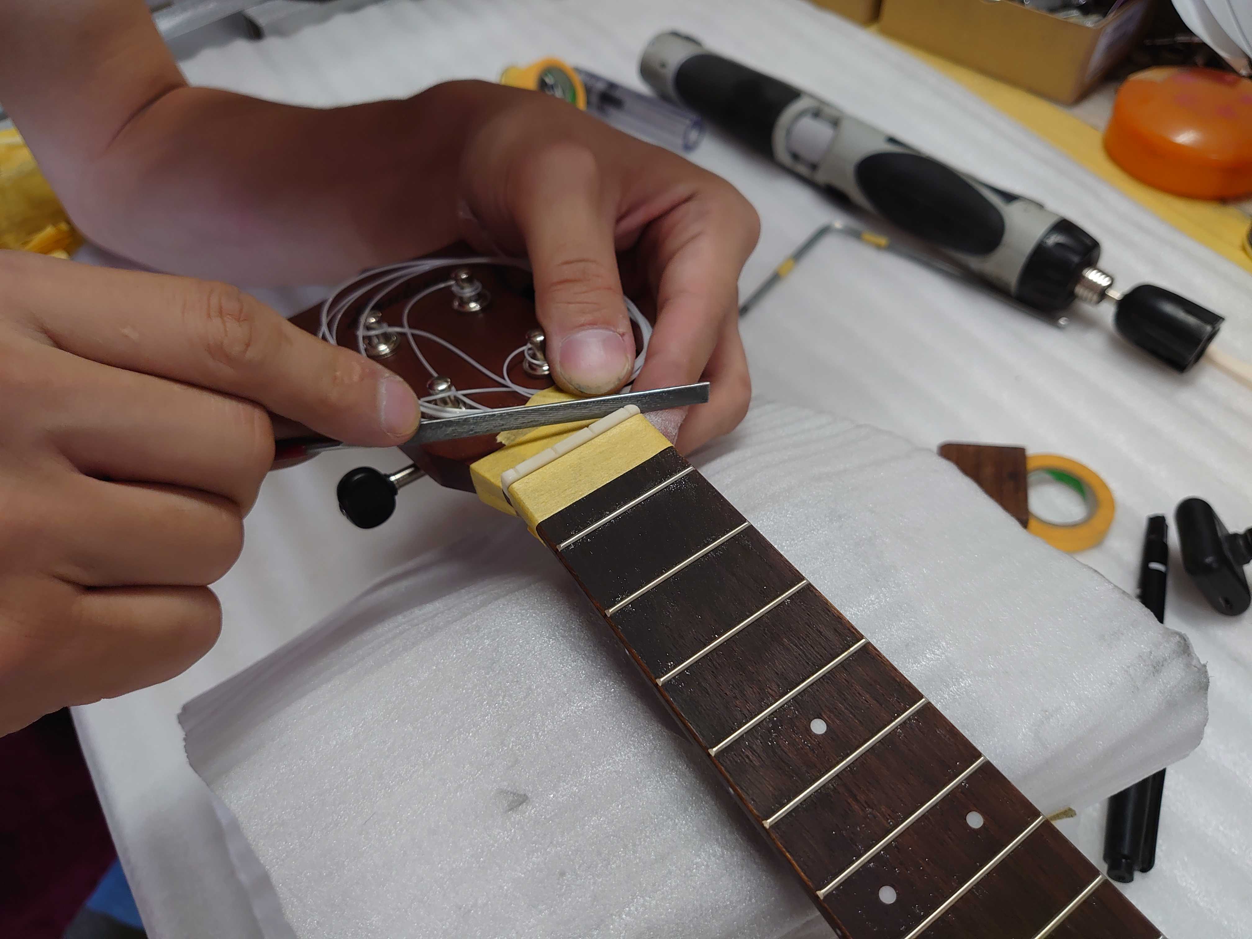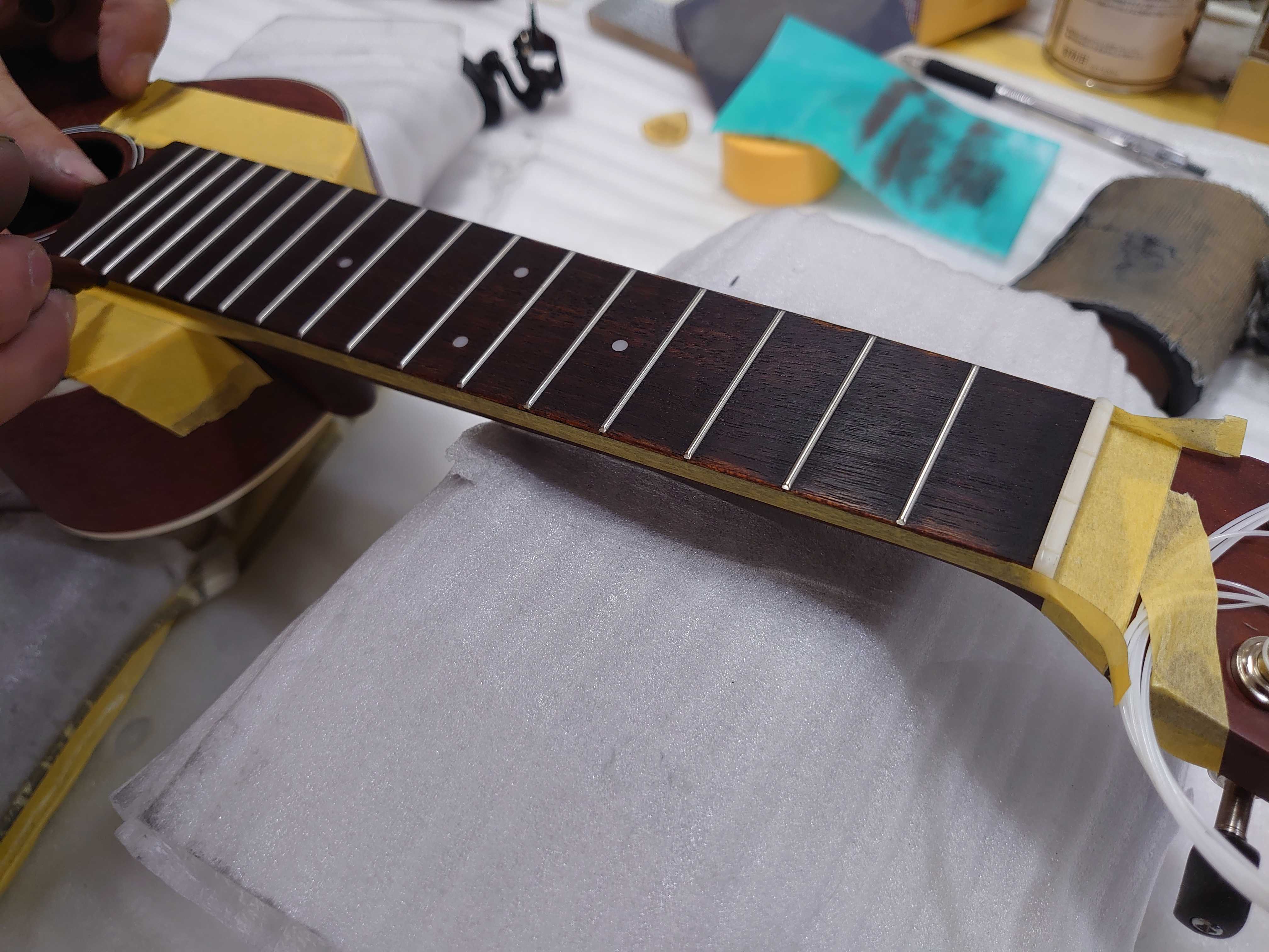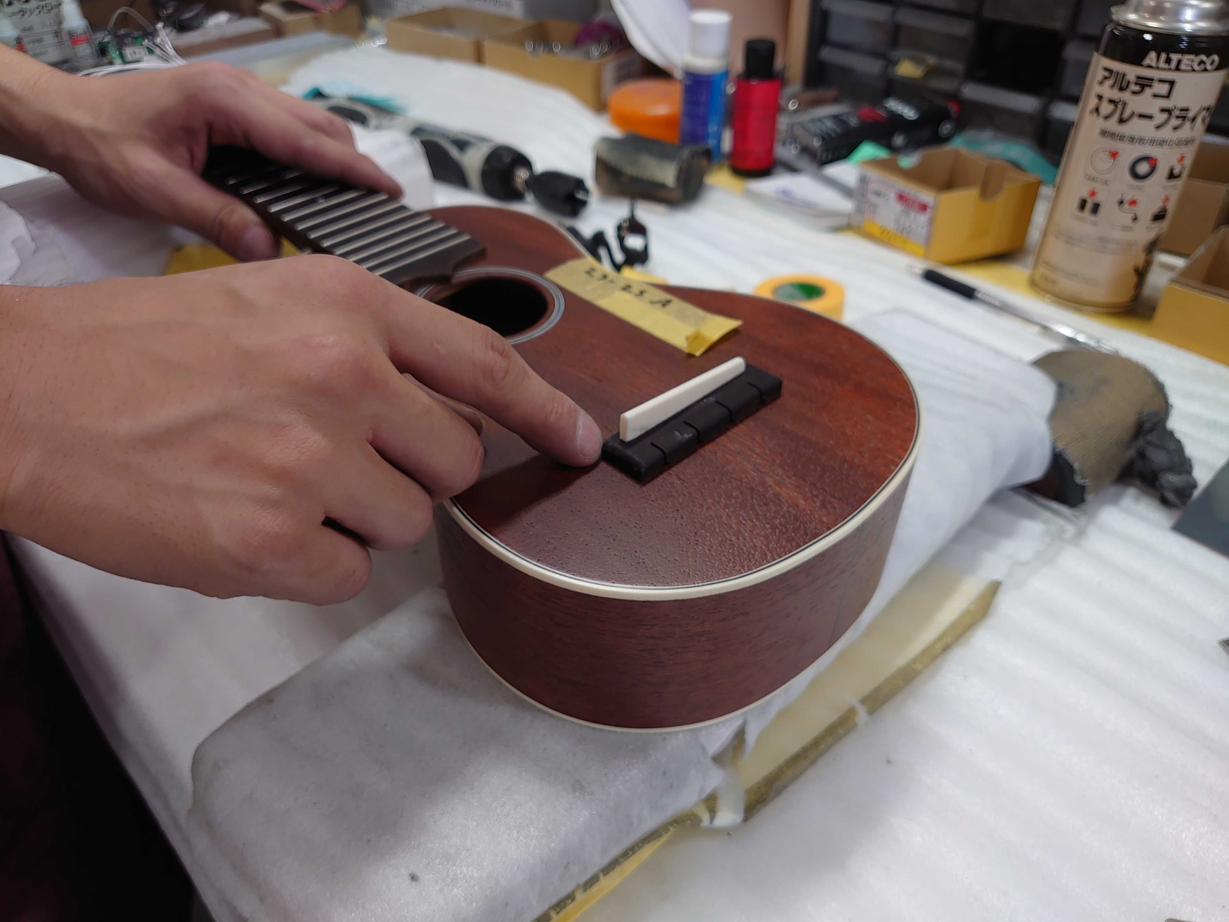サドルの加工、ナットの加工、フレットの擦り合わせ、フレットのエッジ処理等、触れても痛くないように加工し、弦高やナット溝の深さも通常のアコースティックギターの時同様に調整しています。