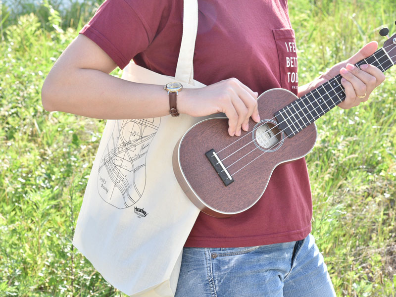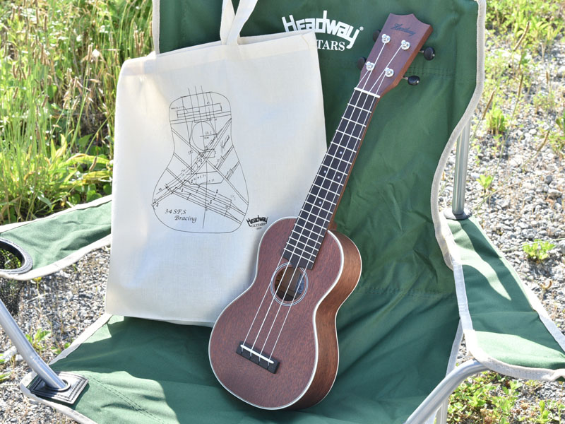 もちろん!こちらのウクレレも只今実施しております、Headwayサマーキャンペーン「Tシャツ&トートバックプレゼント」の対象商品で期間中にご購入頂きました方には、Headwayマスタービルダー百瀬恭夫直筆のブレイシングパターンがプリントされたトートバックがもらえるんです!