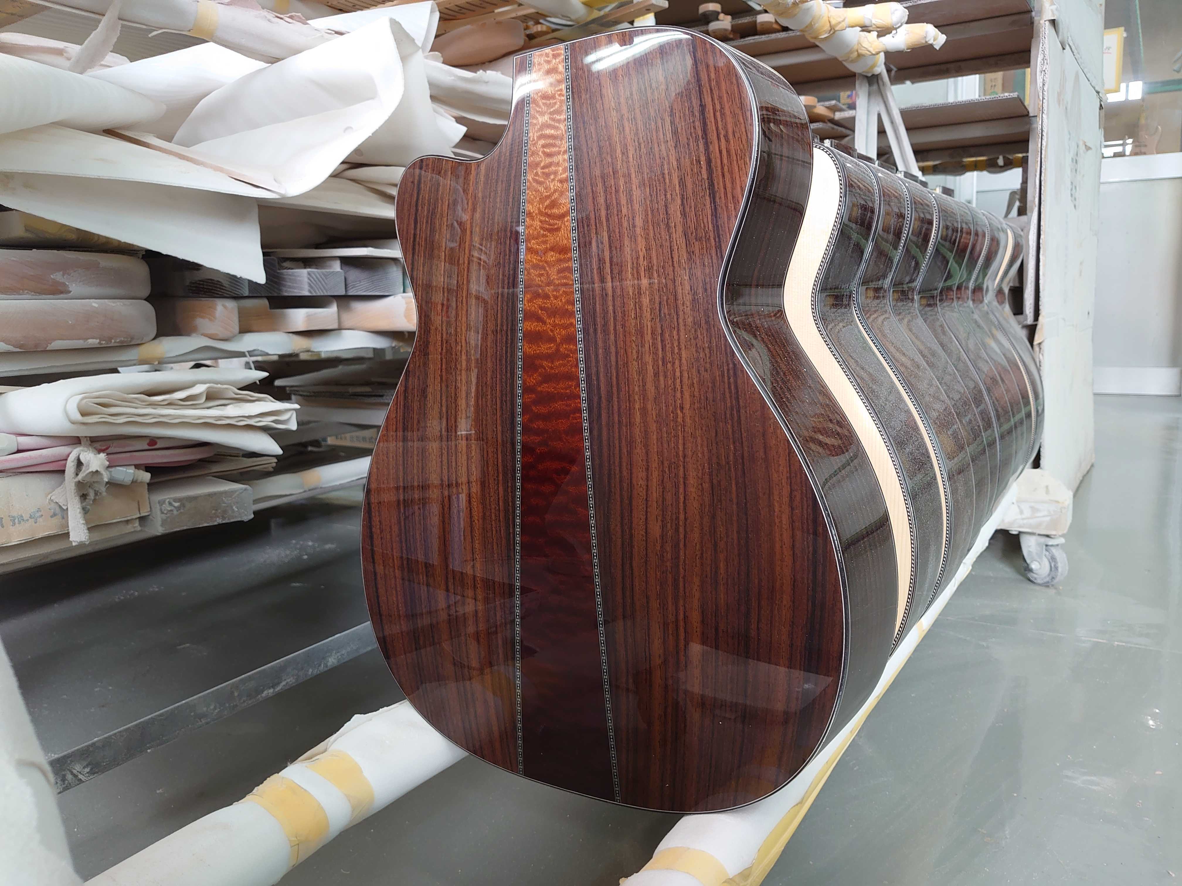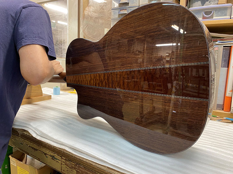 今回のコンセプトモデルはバック材にローズウッドにキルトマホガニーを挟み込んだ3ピークバックになっております。
