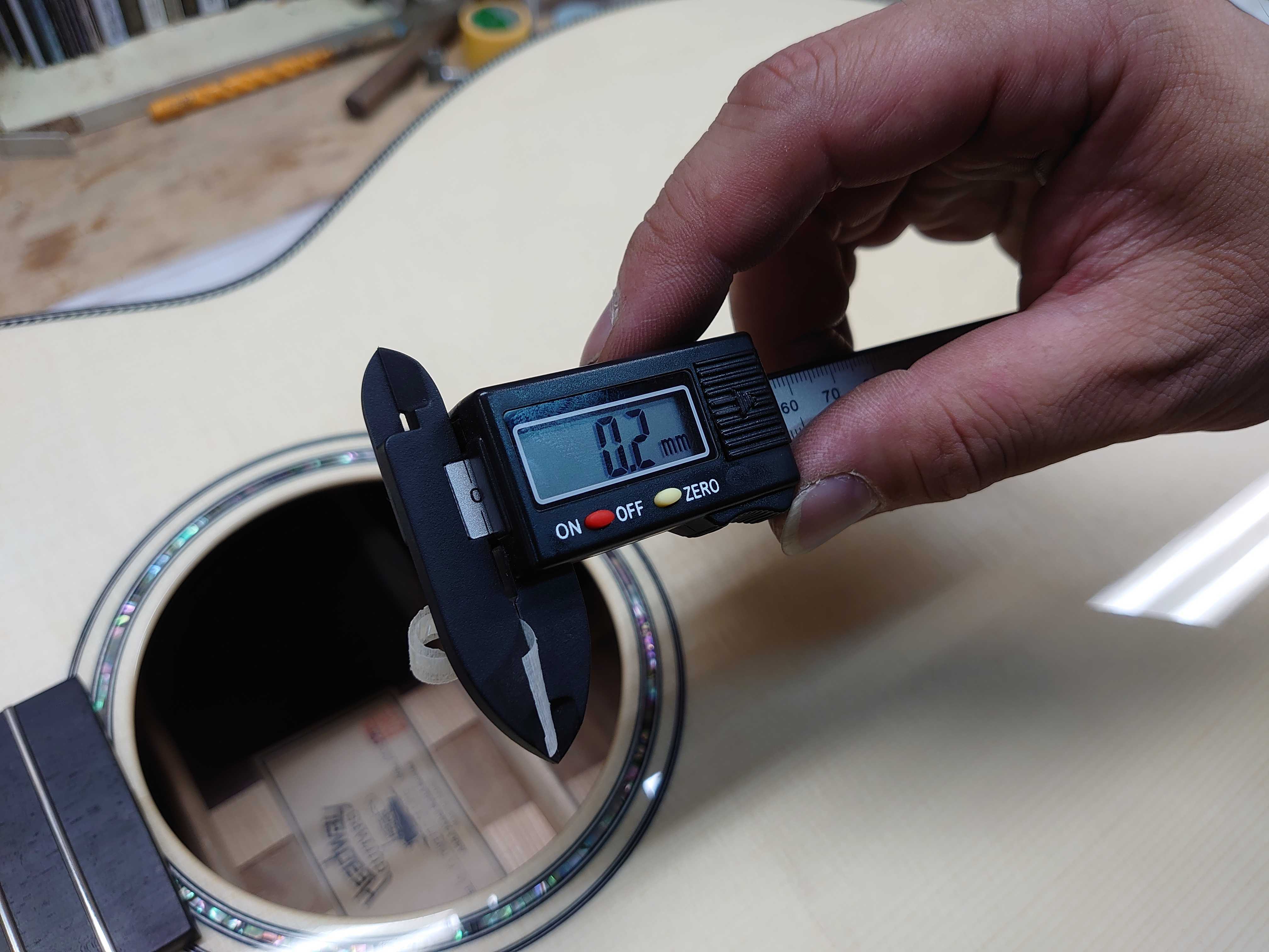 ▲ブリッジ接着の為に剥がした塗膜を計測すると、その厚さはわずか0.2㎜ほど。