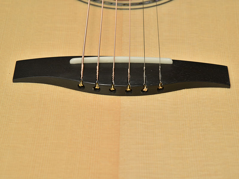 通常アコースティックギターのブリッジはブリッジピンによって弦を固定する方法ですが、今回のコンセプトモデルではブリッジピンの無いピンレスブリッジを採用しています。