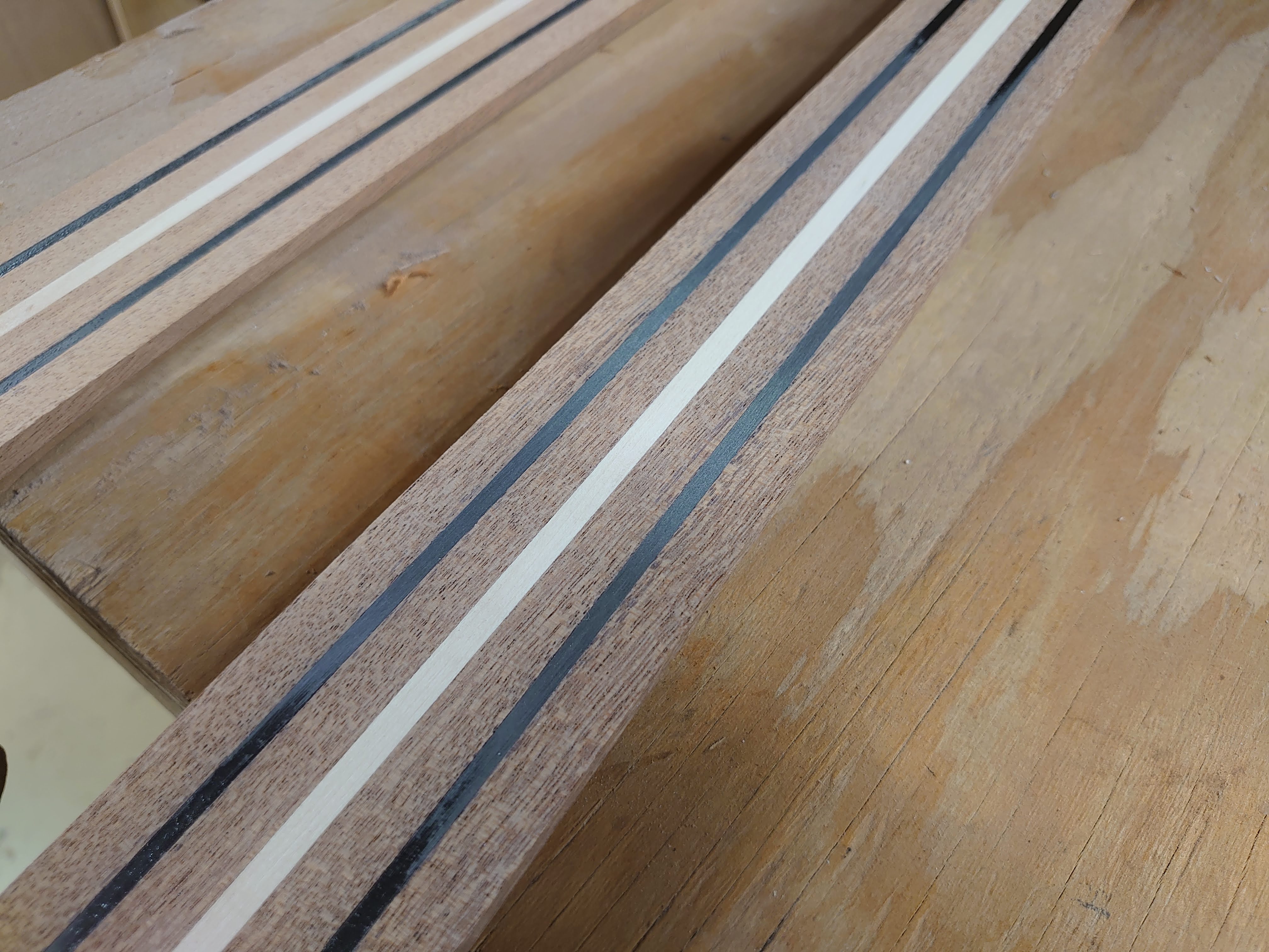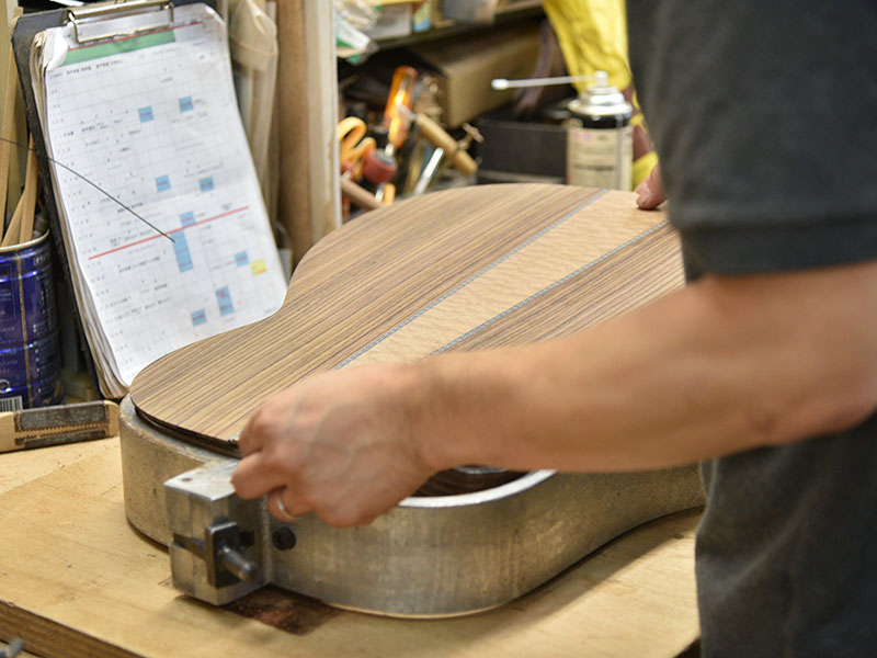 ▲これから組み合わされるボディのトップ・サイド・バックの材料。