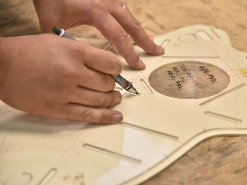▲トップ材に34ブレイシングのパターンを書き込んでいく。