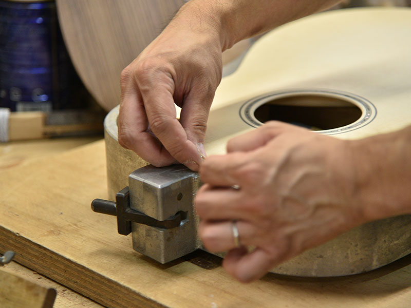 これにより、薄いボディは高音域に煌びやかさが出る為、今回採用した34ブレーシングの迫力ある低音にバランス良く高音域を加える狙いがあります。