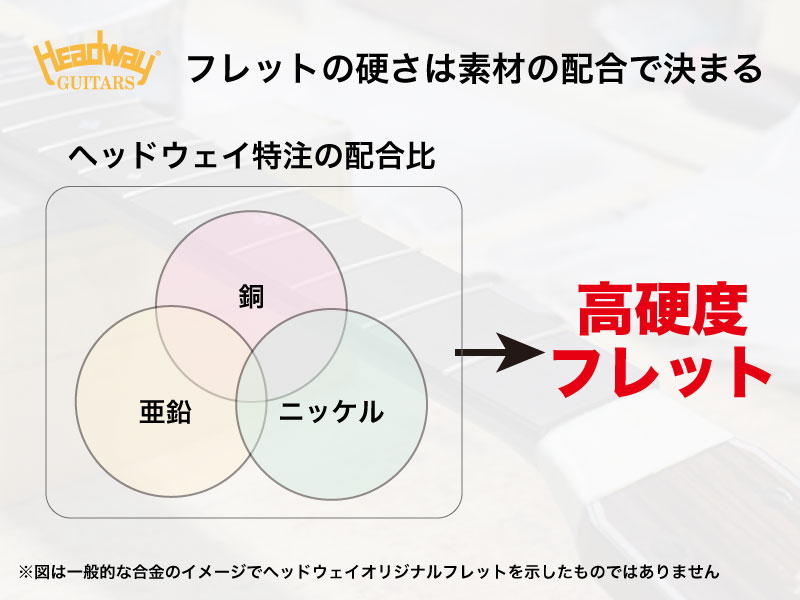 今回ヘッドウェイがフレットメーカーに特注したオリジナルフレットは一般的な「国産フレット」として表現されるものよりも硬度を上げ、さらにフレットの山を従来のフレットよりもごくわずかに(約0.2mm)高くすることで長寿命化を実現しました。
