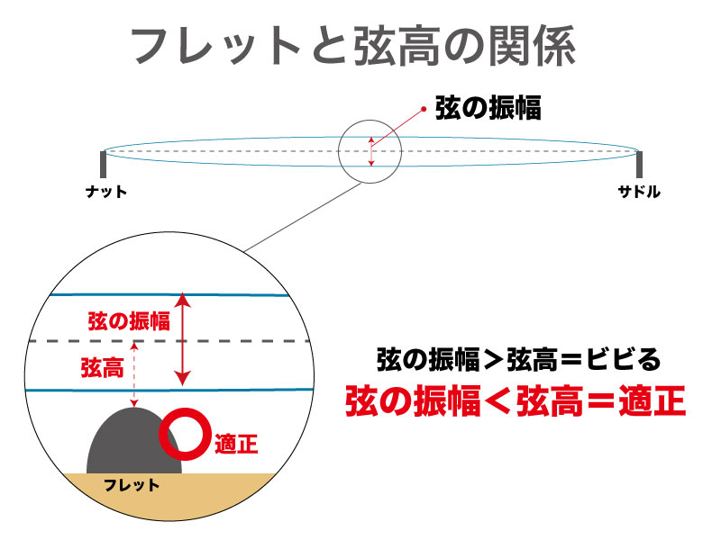 少しだけ高くするのがポイントで、演奏性に大きな影響を与えずにフレット交換時期を伸ばすことができます。