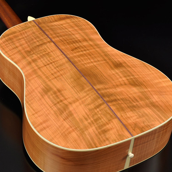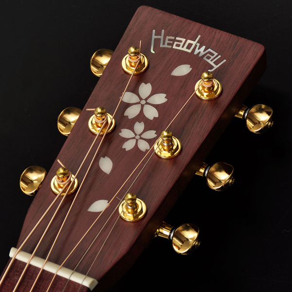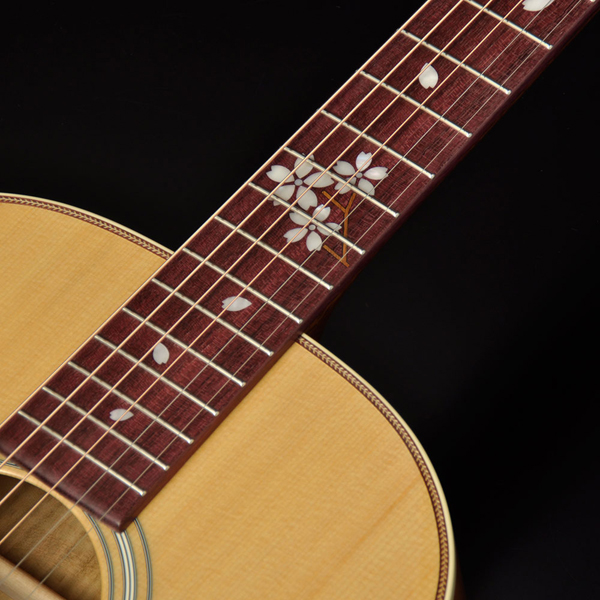 ヘッドウェイで使用される桜の木は山桜や本桜といった日本古来より親しまれている桜を使用しています。また飛鳥チームビルドに使用される桜はフレイム杢が入った特別な個体を厳選して使用しています。サクラのイメージを生かし、ヘッドから指板にかけてサクラの花びらをモチーフとするインレイが入り、更にピックガードも花びら型に。ヘッドから指板、ピックガード、ブリッジには「パープルハート」という紫色の希少材をナチュラルカラーで使用しました。