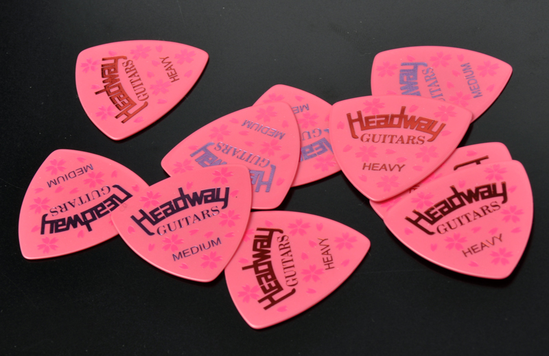 HEADWAYのピックに新しいデザイン、本日入荷いたしました!桜をモチーフとしたデザインのオニギリ型ピック、厚みはHEAVY(1.00mm)とMEDIUM(0.75mm)の2種類です。材質はセルロースで、ヘッドウェイのロゴが入っており、光に反射してキラキラと輝いております。