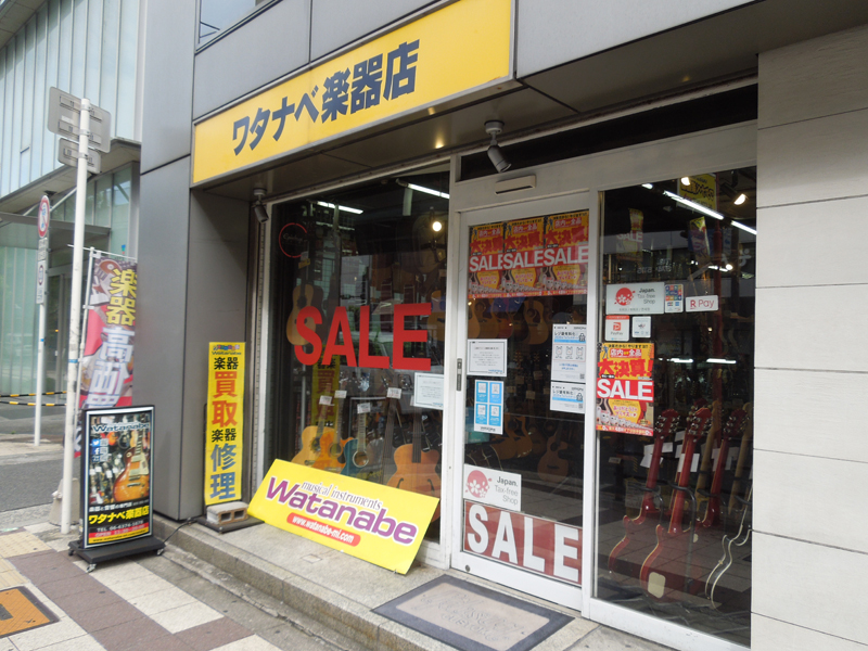 黄色い看板、青い文字!“ワタナベ楽器店”の文字が目に飛び込んできました。
