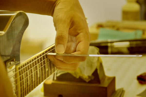 現在、多くのギター工場ではコンピューター制御によるNCルーターによって一度に数工程分の加工が進められ、これによって均一に敏速に、かつ大量に生産することが可能になります。しかし、素材として木材の質は均一ではなく一枚一枚に必ず個体差があります。硬い、柔らかい、軽い、重い、といった木が持つ特徴を考慮しながら強く、あるいは弱く削ることができる熟練のクラフトマンの方が、決まって同じ力で削るNCルーターよりも最終的な加工精度の面で合理的なのです。