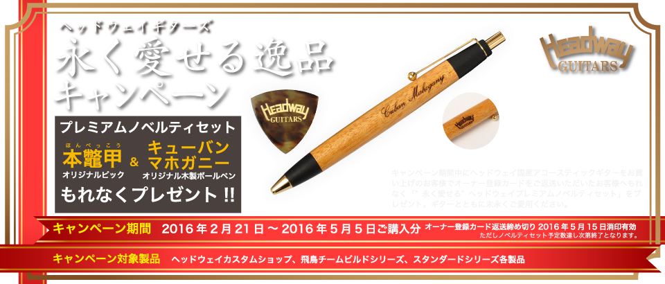 期間中にヘッドウェイ国産モデル(カスタムショップ、飛鳥チームビルドシリーズ、スタンダードシリーズ)をお買い上げいただき、本体付属の「オーナー登録カード」に必要事項を明記の上ご返送いただいた皆様にもれなく「オリジナル"キューバンマホガニー"ボールペン」「オリジナル本べっ甲ピック」のプレミアムノベルティセットをプレゼント!!
